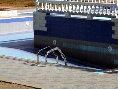 - Elektroarbeiten wurden bei eingelassenem Wasser und badenden Kindern ausgeführt. ( Bild 13,14 ) - Die Spaltmaße der teilweise verlegten Gehwegplatten waren manchmal so groß, das ein Kinderfuß ohne Weiteres darin verschwinden konnte. Zudem waren die Platten so ungleichmäßig verlegt, das die Kinder und selbst Erwachsene über die Absätze stolperten. ( Bild 11,12 ) - Der zweite Pool im Anbau war noch nicht in Betrieb genommen worden. Es war noch nicht einmal Wasser drin. ( Bild 5-8 )